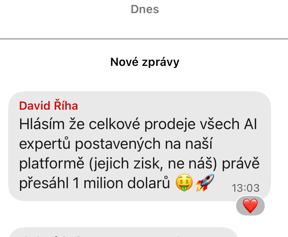 Prodáváte pouze přístup k vašemu AI expertovi jako hlavní službu - jako mentora, kouče, průvodce ve vašem tématu, se kterým si může člověk povídat 24/7.