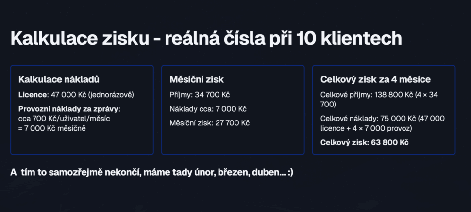 Prakticky to znamená, že když prodáte klientovi měsíční tarif za 3470 Kč, ve kterém má 1000 zpráv, tak teoreticky, kdyby je použil všechny, máte na tom náklad cca 1600 - 1800 Kč a zisk 1670 - 1870 Kč.