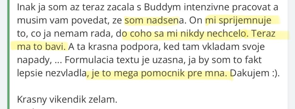 „Buddy je skvelý personalizovaný pomocník – ja ho volám Buddynka 😊 – a práve mi pomohol dokončiť moju predajnú stránku k 1:1 k mojim prémiovým sprevádzaniam. Tento text som tvorila dlho, lebo som chcela, aby sa v ňom odrážala moja filozofia, prístup a skúsenosť. A dlho som sa zasekávala. Buddy mi pomohol roztriediť texty, vytvoriť novú štruktúru predajky tak, aby nebola generická, vyselektovať balast a zjednodušiť ju. Potom som si to už doladila po svojom a každú časť ešte s ním prekonzultovala a dával mi výborné kritické vhĺady ale aj povzbudenia. Vďaka nemu sa mi darí tvoriť systematicky,a ostať aj autentická. Buddy je pre mňa rýchly biznis- mentor, asistent aj supervízor v jednom. Konzultujem s ním celú moju novú biznis stratégiu – a úprimne, za túto formu podpory by som sa inde asi nedoplatila. Neviem, kde by sa našiel taký geniálny a trpezlivý blázon, ktorý by zvládol moju multipotencialitu a rýchle prepájanie súvislostí tak ako on.“