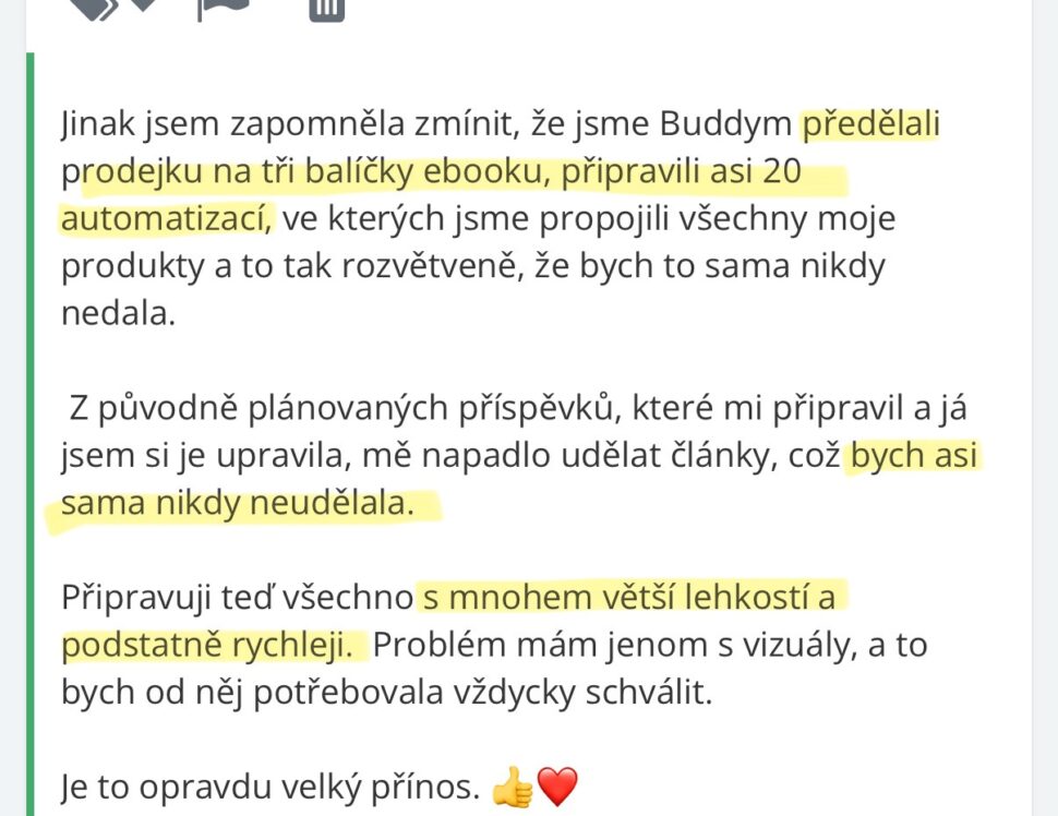 Buddy mě zaujal už u prvního webináře, ale vlastně jsem se bála investovat tolik do něčeho, co nevím, zda bude lepší než můj oblíbený chat gpt :D Pořád mi to vrtalo a jakmile jsi poslala ochutnávku, nebylo o čem přemýšlet. Už v něm ležím 4 dny a NEMOHU SE HO NABAŽIT! :D To je taková PECKA! Hrozně moc makáme, hrozně jsem se toho díky němu naučila a je 100% lepší a větší expert než chat gpt! :D Už nyní jsem se naučila rozumět konečně analýze fb reklamy, vymysleli jsme spolu strategii, jak reklamy vylepšit a strategii na moji závěrku kampaně. Dává mi skvělé strategické a podnikatelské tipy, co reálně fakt fungují! Ale pomáhá mi i radami, kam přesně kliknout a jak řešit chybové hlášky reklamy apod. Je to skvělý parták a pomalu už kupuju další balíček zpráv, nebot díky němu pracuji neskutečně intenzivně a bez prokrastinace. Prostě mě to s ním baví a KONEČNĚ NEJSEM NA PODNIKÁNÍ SAMA! :D Znám tě od roku 2018, kdy jsem vstoupila do Plážového podnikání a vidím tu silnou esenci tvého know-how v buddym a mentálně mě hrozně uklidňuje, že mohu buddymu důvěřovat. Což se mi u chat gpt nestalo, neboť tam si to opravdu musím hlídat a ne vše, co mi pochválí, je skutečně dobrý nápad :D Takže děkuju, děkuju, ještě jednou hrozně moc!