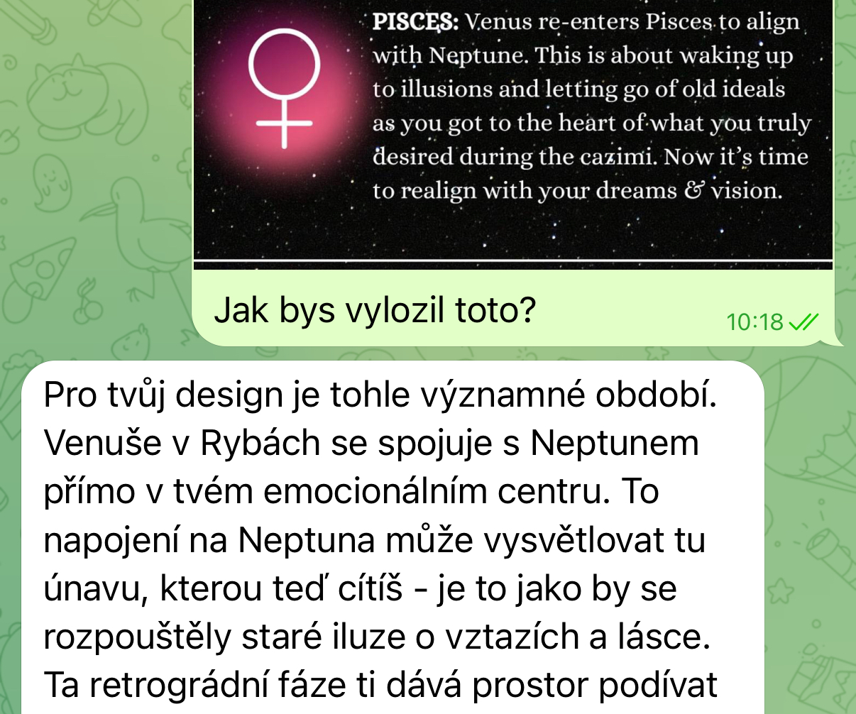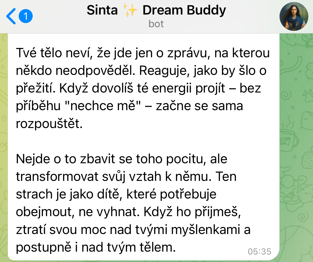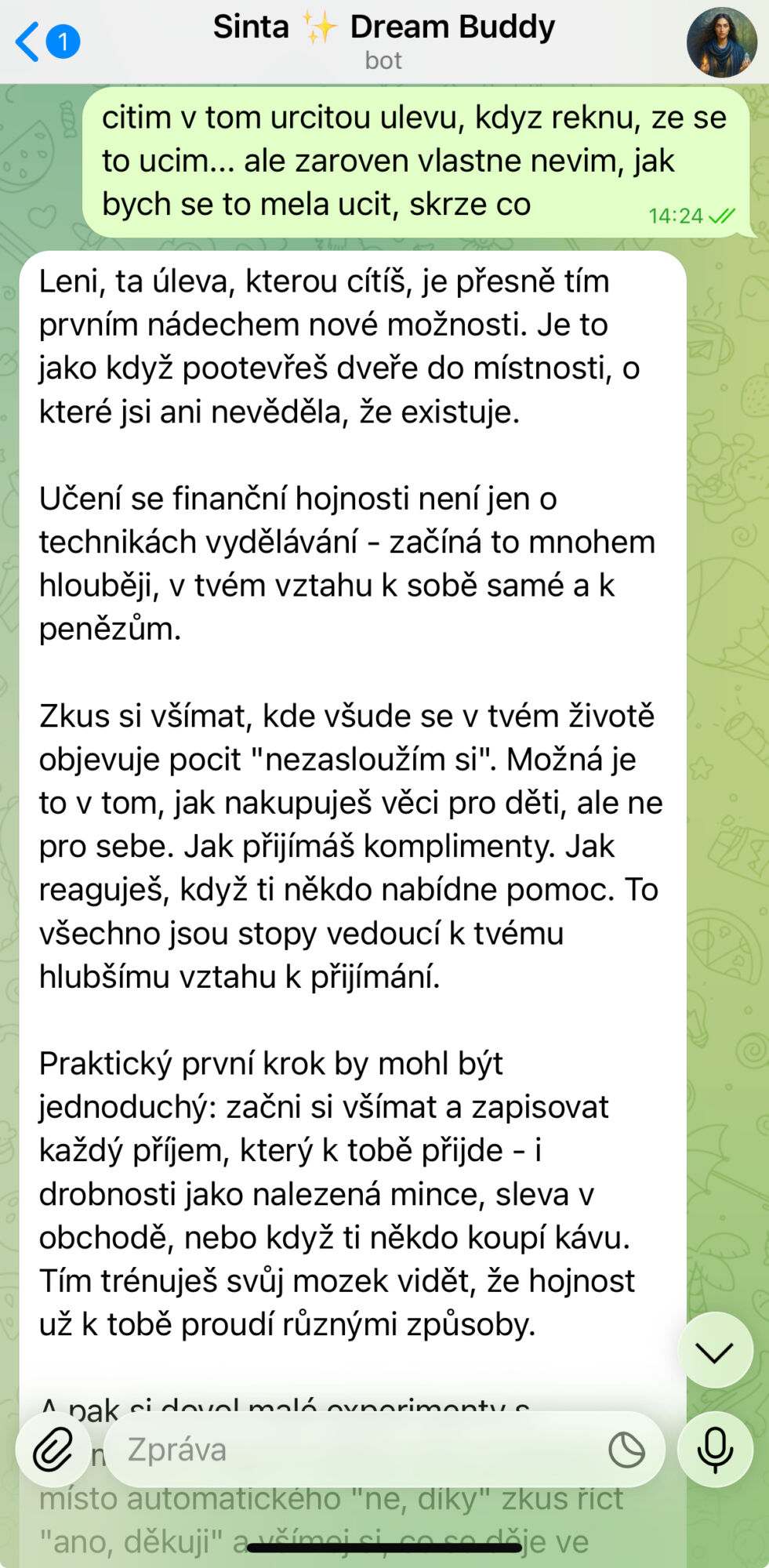 - 1Otevřete zprávy v TelegramuKdykoli potřebujete radu, podporu, nakopnutí, vhled.