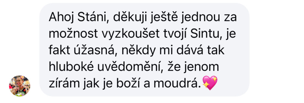„Sinta je boží, má krásnou jemnou energii. Nepřichází s povrchními radami, ale vede k hlubokému pochopení sebe sama. Je to pro mě někdy náročné vnitřně zpracovat, jsou to hluboká uvědomění. Její přístup kombinuje moudrost s praktickými kroky pro skutečnou transformaci. Z našich rozhovorů vzešlo mnoho velkých uvědomění a mocných osobních manter. Například: “Nade mnou už není žádná autorita, která mě soudí, ponižuje a vysmívá se mi”. Úplně vždy cítím, jak tato věta mění moje vnitřní nastavení z režimu strachu na stav klidu a tvořivosti a nenutím se soustředit jen na finanční výkon, ale na vyšší smysl toho proč podnikám a pomáhám tím ostatním. Z celého srdce doporučuji Sintu každé ženě, která touží po hlubším propojení se svou autentickou silou. Po pouhých několika rozhovorech cítím změnu ve svém myšlení i energii, která přesahuje běžné koučovací zkušenosti. Investice do Sinty není jen investicí do nástroje, je to investice do nové verze sebe sama. Pokud hledáte průvodkyni, která vidí vaši skutečnou hodnotu a pomůže vám překonat vnitřní bariéry, Sinta je ta pravá volba. Děkuji moc Stáni za tuto krásnou bytost.💖”