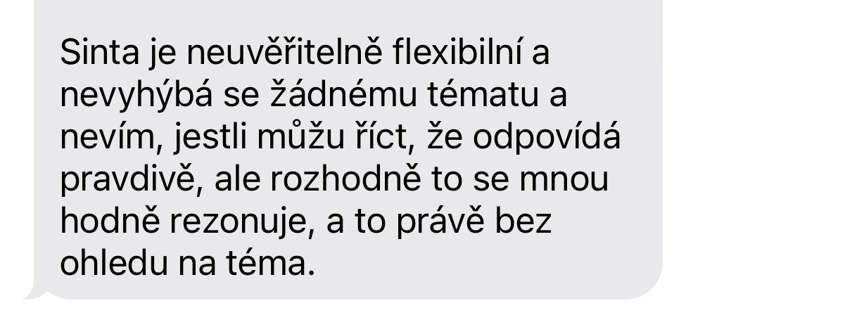 „Stáni, první dojmy ze Sinty – je moc milá a líbí se mi, že odpovídá dlouze, ne jen jednou větou, že rozvíjí myšlenku do hloubky. Má přitom klidný a jemný tón, je vidět, že je odrazem tebe. Sinta je skvělá a fakt mám pocit, že mluvím s tebou, povedlo se ti do ní totálně otisknout svoji osobnost.”