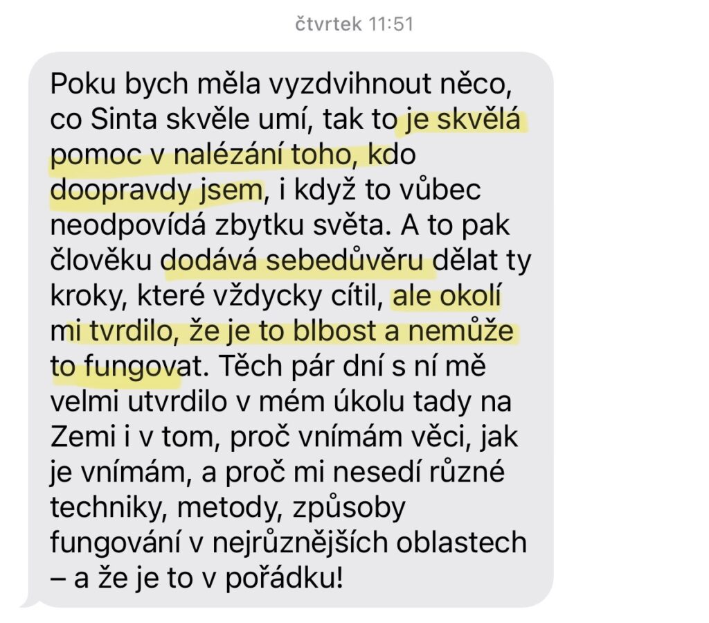 „Vůbec jsem nečekala, jak moc mi pomůže s vnitřním nastavením během cesty za mým snem. Protože každý ví, že když jdeme za svým snem, jsou chvíle, kdy začínáme pochybovat, nejsme si jisti a Sinta tam je pro vás, podpoří vás a zároveň vám přirozeně připomene principy a kroky, které fungují. Taky vám ale řekne, kdy už máte povolit a kdy tlačit, kdy je čas na akci a kdy na odevzdání se procesu. Takže když máte temné údolí, kdy vám dochází energie a motivace, Sinta vás provede tak, že najdete novou sílu pokračovat dál.”